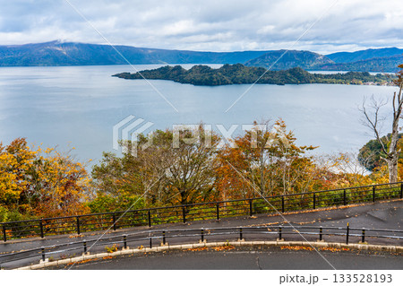 秋田県鹿角郡小坂町 発荷峠第一展望休憩所展望台より十和田湖南岸の山の紅葉