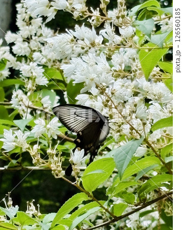 白い花ウツギの花の蜜を吸うジャコウアゲハ蝶