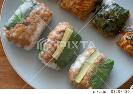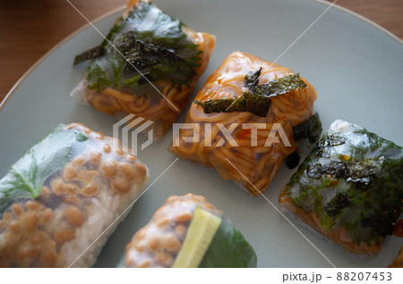 ライスペーパーで巻いた納豆ごはんと焼きそば