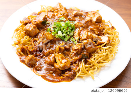 オリジナル料理のマーボー焼きそば、麻婆ヤキソバ、麻婆焼そば。