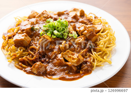 オリジナル料理のマーボー焼きそば、麻婆ヤキソバ、麻婆焼そば。