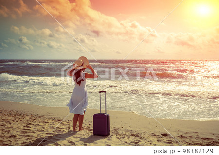 Young happy woman in a straw hat with a travel suitcase walks on the beach