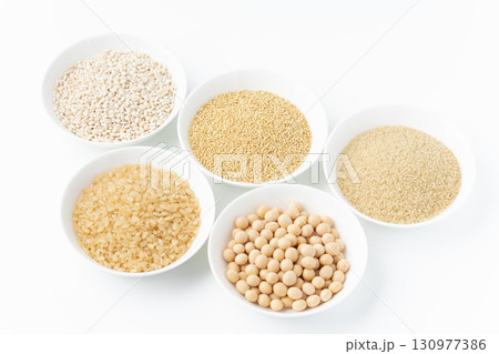 白背景に並べた五穀(玄米、大豆、麦、粟、稗)