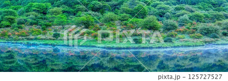 レンゲツツジ咲く新緑の覚満淵(パノラマ)