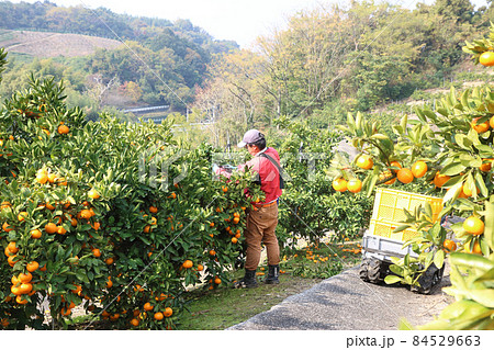みかんの入ったコンテナを運搬車から軽四に積み替えている若い男性