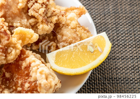 鶏肉の唐揚げに添えられたレモンのアップ。