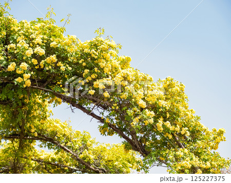 青空に映える満開のモッコウバラのアーチ