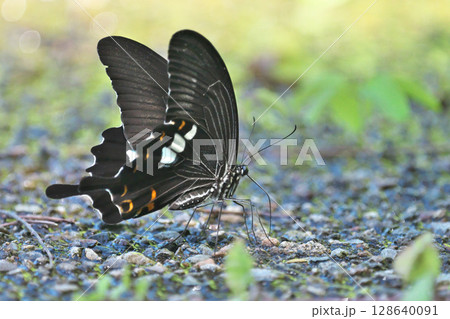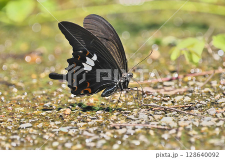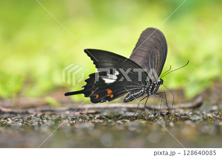 モンキアゲハが水溜りに降りて、翅を広げて水を飲んでいる。