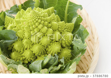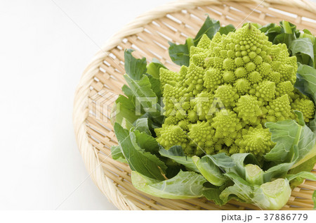 ザルに乗せたイタリア野菜ロマネスコ【白背景・切り抜き】