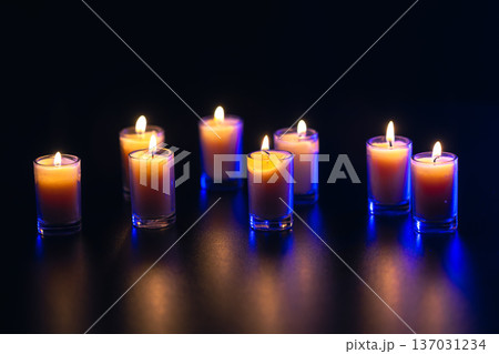 A lot of burning candles in the temple in the dark. The concept of religion, prayer and God.