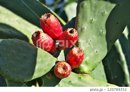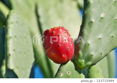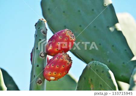 Opuntia ficus-indica, prickly pear. Prickly pear cactus with red fruits