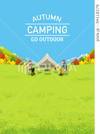 秋キャンプを楽しむ若い家族 - 縦構図 A4比率 文字付き