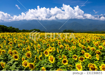 山梨県北杜市明野町浅尾 明野サンフラワーフェスの満開のひまわり畑と南アルプスの山々