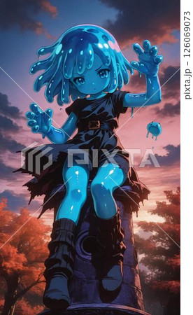 Mysterious Blue Slime Anime Girl on Ancient Pillar at Dusk