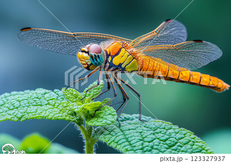 Dragonfly is sitting on a leaf.