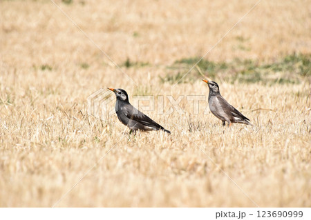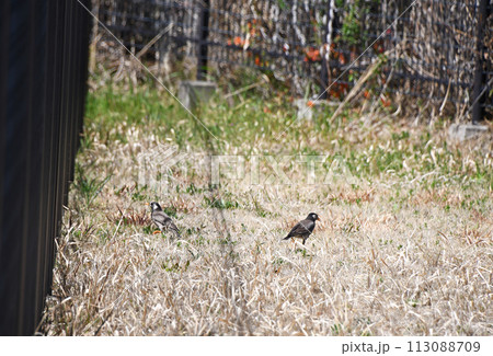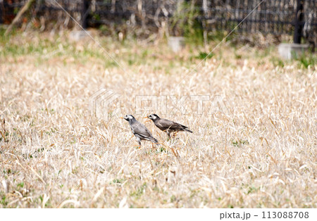 早春の枯れ草の中のつがいのムクドリ(椋鳥)
