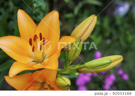 Lilies bloom in the garden, floriculture as a hobby in the summer garden. Concept of gardening, floriculture and landscape design.