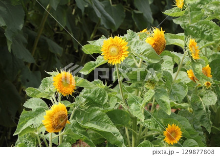 黄色い大輪のひまわりが咲き誇る、夏の青空の下の花畑