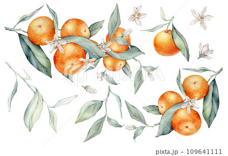Set of mandarin branches with green leaves and flower. Hand drawn tangerines isolated background. Watercolor clipart illustrations. collection of citrus fruits. orange botanical painting