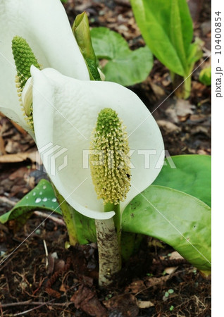 湿生植物水芭蕉の花期・花穂の黄花を包む純白の花のような仏炎苞・2輪横位置