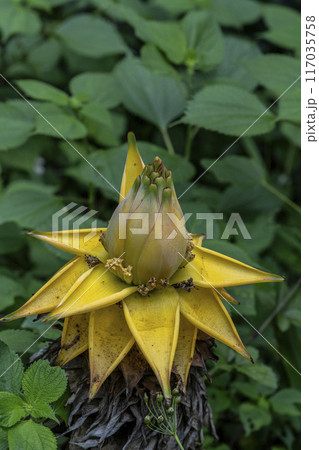 湿生植物水芭蕉の花期・黄花の密集する太い花軸(肉穂)を包む純白の花のような仏炎苞・1群れ縦位置
