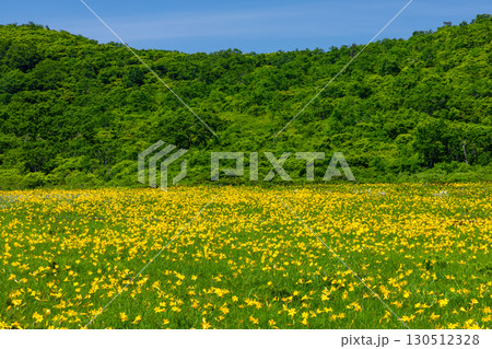 福島県喜多方市熊倉町雄国 雄国沼湿原を覆う満開のニッコウキスゲ群生と周りの山々の緑