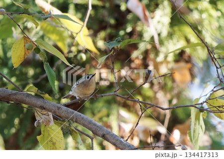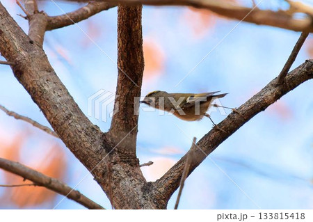 針葉樹の木の中で餌を探して飛ぶキクイタダキ