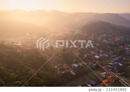 Sunrise over Thai tribe village in foggy with wild himalayan cherry tree blooming at Ban Rong Kla, Thailand