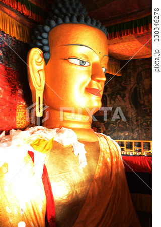 Face of Sakyamuni Buddha, a large golden Buddha statue in the Shey Palace. The Shey Monastery or Gompa and the Shey Palace complex are structures located on a hillock to the south of Leh in Ladakh.