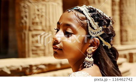 Beautiful woman in traditional Egyptian clothing in an ancient Egyptian temple.