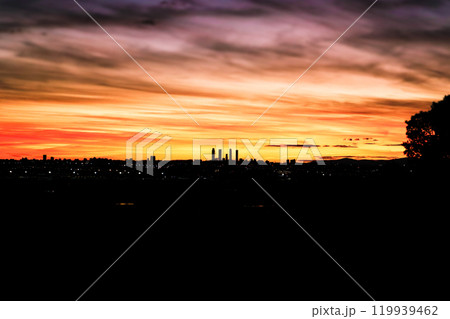 Fantastic sunset sky. Beautiful view of a night city Cuatro Torres business center, four office skyscrapers on a horizon, the tallest buildings in Spain located in Madrid. Spanish sightseeing postcard