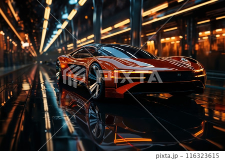futuristic car on a glossy road in a tunnel with transparent walls, transport of the future, city streets