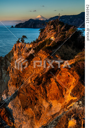黄金崎と馬ロックの夕陽と富士山【静岡県賀茂郡西伊豆町】