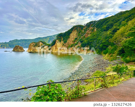 【青森県深浦町艫作(へなし)漁港】艫作港西防波堤灯台から黄金崎を望む