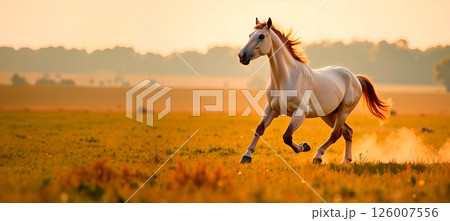Majestic pale horse galloping across sunlit field at dawn. Copy space, for text. Banner