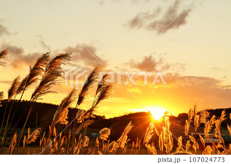 北海道 秋の夕暮れとススキ