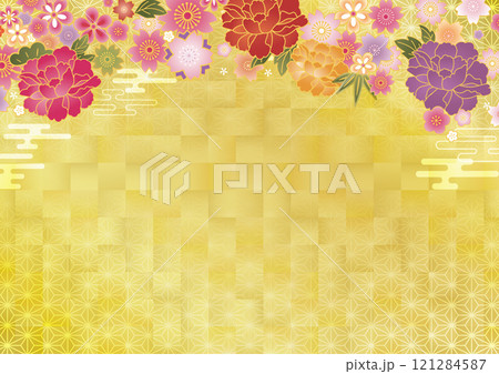 ゴールドの波柄バックに花や和風雲模様入りの背景素材イラスト