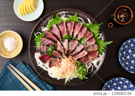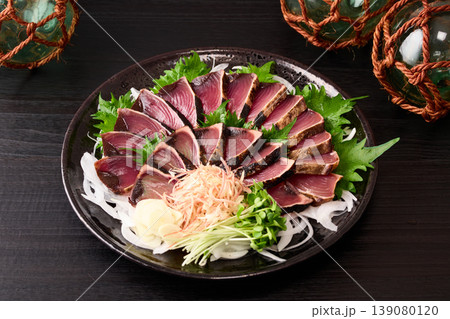 大皿に盛り付けた鰹の藁焼き