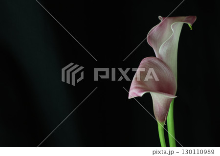 Bouquet with pink flowers and green leaves of calla (Zantedeschia) on dark background
