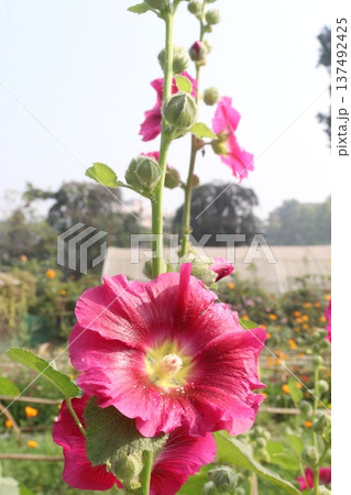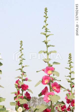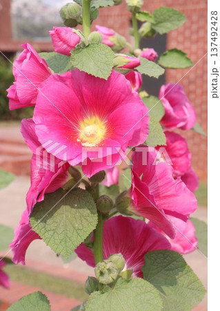 三鷹中原に咲く赤い八重咲きタチアオイの花