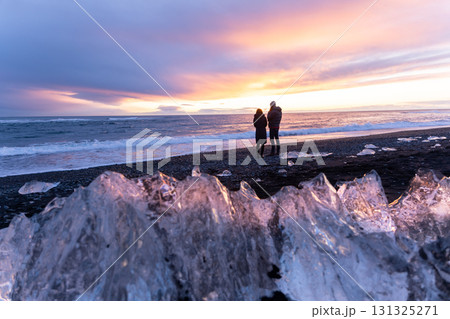 Impressive pieces of the iceberg sparkle on famous Diamond Beach at Jokulsarlon lagoon during sunset.