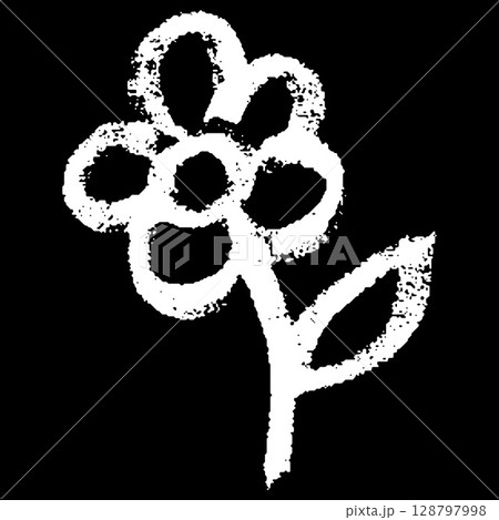Chamomile flower white chalk hand painting on black background, vector doodle daisy flower with leaf childish crayon art