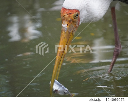A painted stork perched on a branch, displaying its distinctive long orange beak, black and white patterned wings, and pinkish feathers.