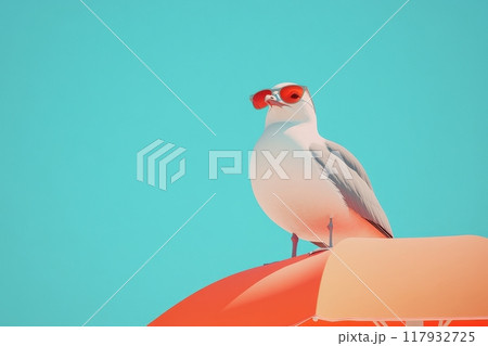 A seagull is wearing sunglasses and standing on top of an umbrella with Generative AI