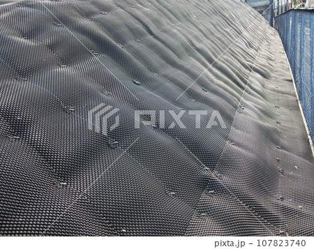 高層集合住宅外壁修理のために取り付けられた黒いシート