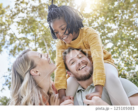 Adoption, family and parents with girl, outdoor or smile together with happiness. Adopted daughter, mother or father carry black child, happy or relax with love, diversity, and play for quality time.