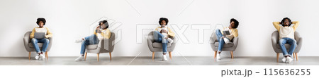 Digital Activities. Collage With Happy Black Guy Using Different Gadgets Sitting In Armchair, Browsing Internet On Laptop, Smartphone And Digital Tablet At Home, Enjoying Online Leisure. Panorama