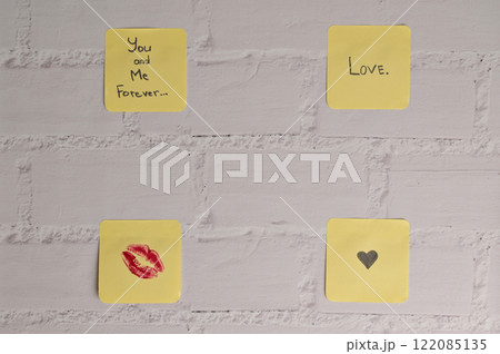 Four yellow sticker papers with lipstick kiss mark, inscription "Love you!", "You and me forever" and small black heart on white brick wall background. Romantic message for Valentine's Day