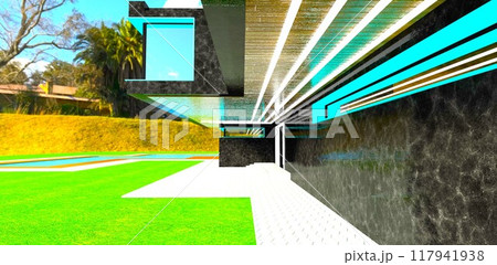 Black marble wall combined with a concrete tile walkway on the grounds of a private countryside estate. 3D rendering.