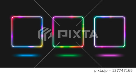 Colorful neon lights illuminating brick wall and wet asphalt floor